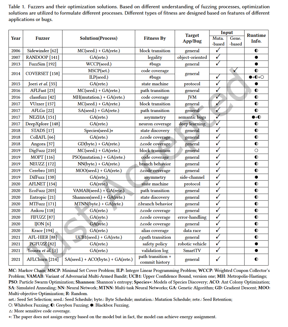为了提高发现漏洞的概率,fuzzer 在执行过程中使用反馈(feedback)机制,例如以执行状态或结果作为 fitnes,一个典型的 fitness 便是基于代码覆盖率(例如基本块或边)进行输入生成,但仅有代码覆盖率并非一直都是可靠的,就算可靠也可能收益不高(例如指数型数量的输入生成可能只带来线性的漏洞发现),因此一种常见的改进方法是优化模糊测试的过程或是为 fitness 丰富信息,Table 1 展示了不同的 fuzzer 的优化方法: